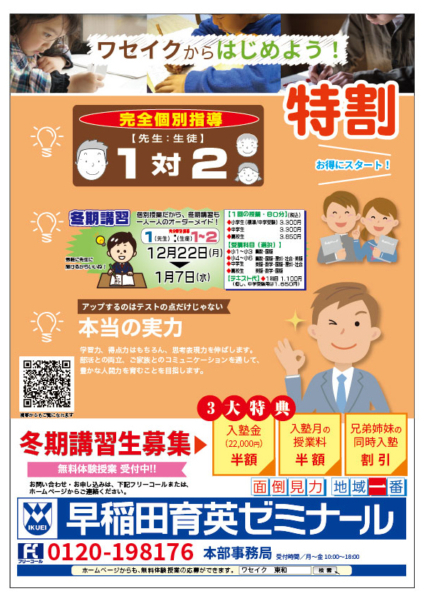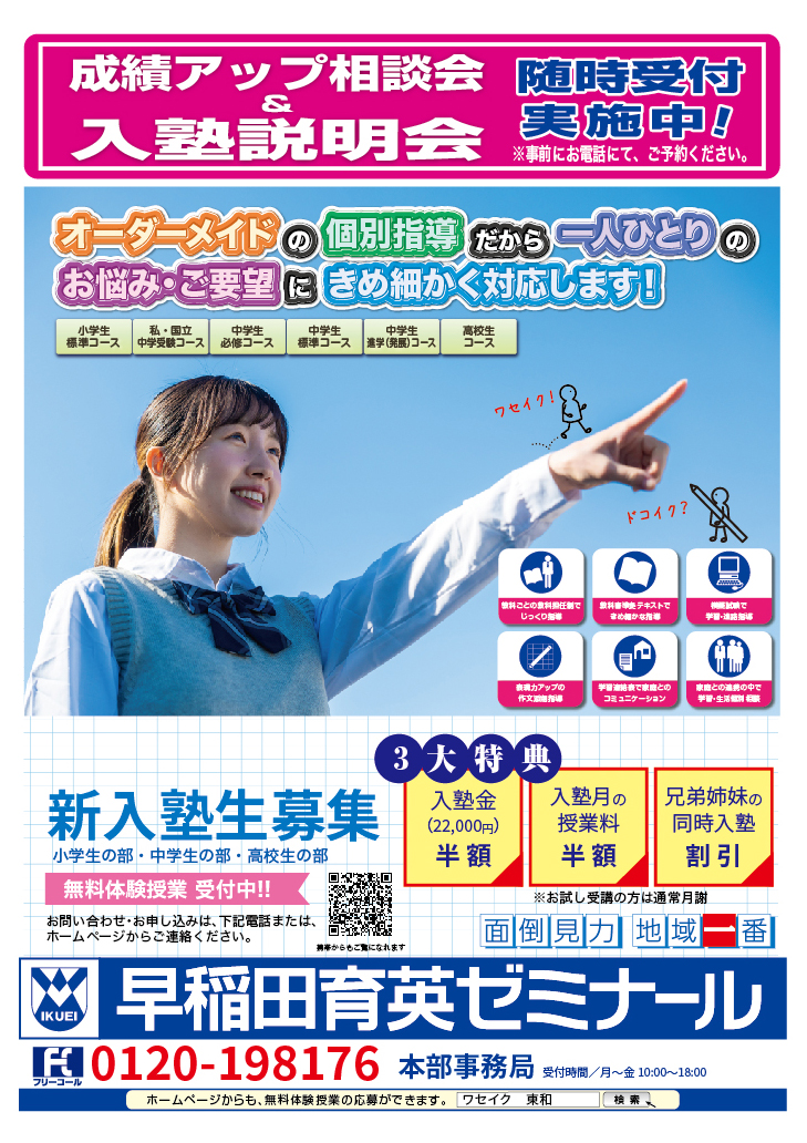 早稲田育英ゼミナールの密度の高い個別指導の良さを理解していただくには、実際に体験するのがイチバン! 個別の良さは体験して初めてわかります! 勉強の仕方や教材選び方など、学習に関することならどん...